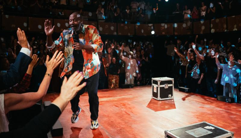 Marianka Swain reviewing for the Telegraph was uplifted: ‘the communal storytelling format remains a neat demonstration of the play’s central thesis: it’s vital to reach out and connect with one another, whether through therapy or theatre. This life-affirming show proves that and more – an absolute tonic.’ As for Lenny Henry, she found it ‘enormous fun watching him take charge of the intimate, in-the-round @sohoplace auditorium and roll with the punches.